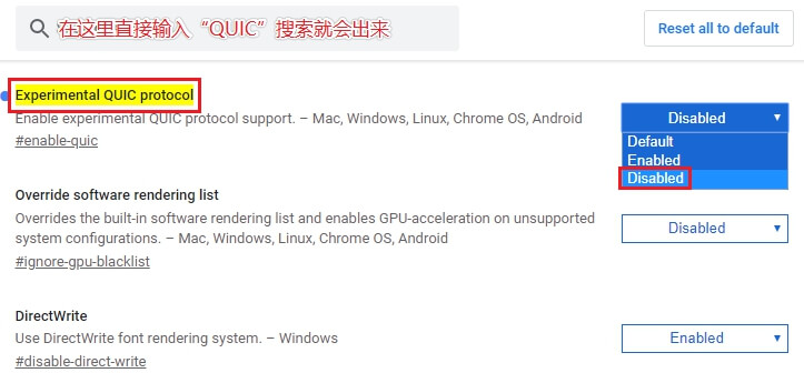 然后就会看到如下图(分别是英文和中文两种语言),在下拉框中可以选择 默认/已启用/已禁用 (Default/Enabled/Disabled) 三个选项,我们只需要把选项改为 已禁用(Disabled) 即可。