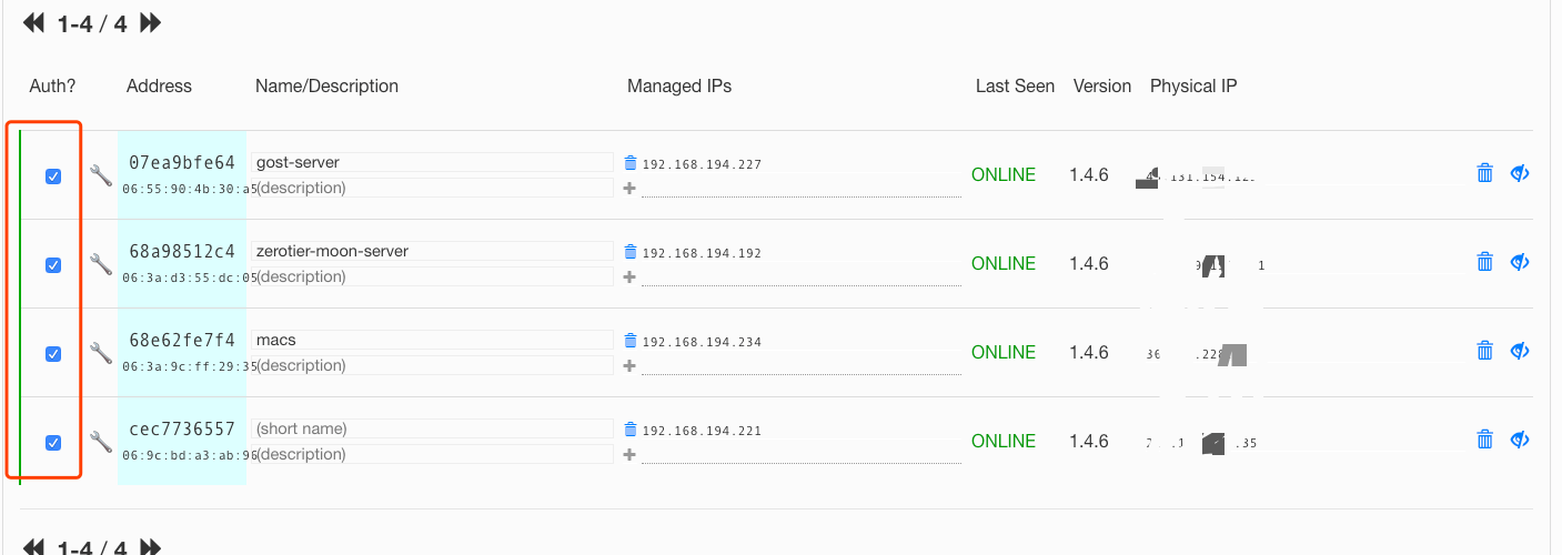 注意:每次我们添加 VPS 到 zerotier 到时候都需要点进我们的 network ID 拉到后方,然后 Auth? 的方框上勾选 如图