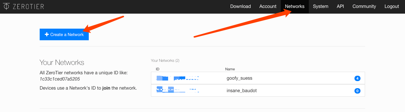 进入 https://my.zerotier.com/ 注册一个账号。然后选择 Networks 添加一个网络