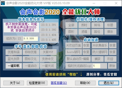 本工具专注于会声会影的优化与设置,不含破解、激活等功能,本工具免费分享,请勿用于商业目的。