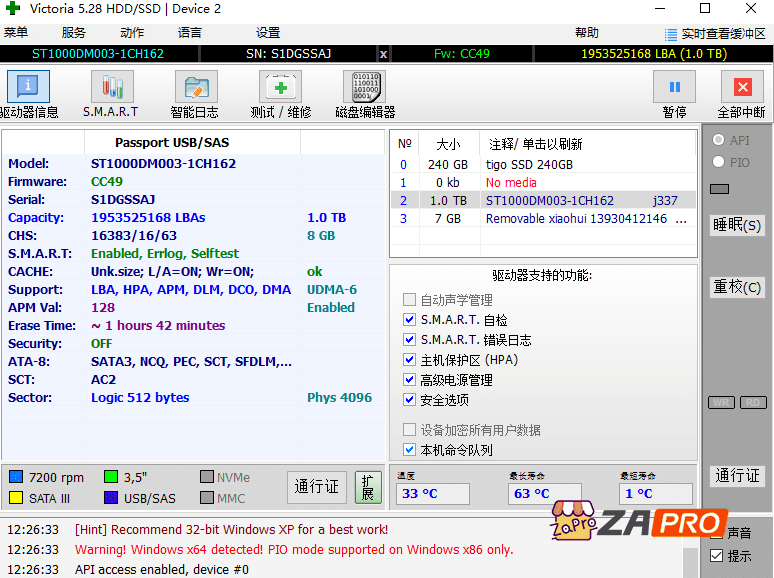 通过USB您可以找到可移动设备隐藏的硬盘驱动器的所有信息,支持90%的USB-SATA桥接器型号,并且这个数字持续更新增加。通过USB增加了缓存管理,通过USB增加了SMART测试。自动声学管理(AAM)也可以在USB驱动器上使用:软件通过更改磁头的移动速度来控制声学噪声的水平。